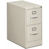 Two-drawer, vertical filing cabinet features a 26-1/2" case depth, label holders and a One Key core-removable lock kit. High drawer sides accept legal-size hanging folders without the use of hangrails. Both drawers have thumb latches and three-part, telescoping, steel ball-bearing suspension. Spring-loaded, follower blocks keep files upright. Follower blocks have positive, slide-action positioning that is adjustable on 5/8" centers. Light gray vertical file has a baked enamel finish over rust-inhibiting, phosphate pretreatment. File is certified by SCS to be in compliance with specific, indoor, air-quality emission requirements and meets or exceeds applicable ANSI/BIFMA standards.
