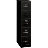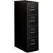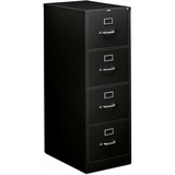 Four-drawer, vertical filing cabinet features a 26-1/2" case depth, label holders and a One Key core-removable lock kit. High drawer sides accept letter-size hanging folders without the use of hangrails. All drawers have thumb latches and three-part, telescoping, steel ball-bearing suspension. Spring-loaded, follower blocks keep files upright. Follower blocks have positive, slide-action positioning that is adjustable on 5/8" centers. Black vertical file has a baked enamel finish over rust-inhibiting, phosphate pretreatment. File is certified by SCS to be in compliance with specific, indoor, air-quality emission requirements and meets or exceeds applicable ANSI/BIFMA standards.