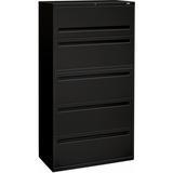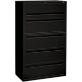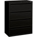 Locking, 42" wide lateral file offers secure file storage in its four fixed front drawers. Each drawer includes two adjustable hangrails for side-to-side filing of letter-size or legal-size folders. Three-part, telescoping, steel ball-bearing suspension delivers smooth opening and closing. Mechanical interlock allows only one drawer to open at a time. Design also features contemporary, full-face, integral drawer pulls; a core-removable lock; and 19-1/4" case depth. Reinforced case construction with flush top and sides has a baked enamel finish over rust-inhibiting phosphate pre-treatment. Black lateral file is certified by SCS to be in compliance with specific, indoor, air-quality emission requirements and meets or exceeds applicable ANSI/BIFMA standards.