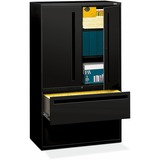 Locking, 36" wide lateral file offers secure file storage in its two fixed front drawers. Each drawer includes two adjustable hangrails for side-to-side filing of letter-size or legal-size folders. Three-part, telescoping, steel ball-bearing suspension delivers smooth opening and closing. Mechanical interlock allows only one drawer to open at a time. Design also features contemporary, full-face, integral drawer pulls; a core-removable lock; and 19-1/4" case depth. Reinforced case construction with flush top and sides has a baked enamel finish over rust-inhibiting phosphate pre-treatment. Black lateral file is certified by SCS to be in compliance with specific, indoor, air-quality emission requirements and meets or exceeds applicable ANSI/BIFMA standards.