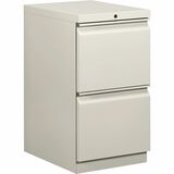 Mobile pedestal with HON Brigade Series 800 lateral-pull design fits under standard HON Initiate, 38000 Series and 29-1/2" worksurfaces. Freestanding pedestal offers a 22-7/8" depth and two file drawers with ball-bearing suspension (90 percent extension). High-sided file drawers feature two crossrails and accommodate front-to-back filing for letter-size, hanging file folders. Counterweight inhibits tipping when opening more than one drawer. Light gray pedestal is also equipped with a HON One Key interchangeable, core-removable lock; fixed front casters; and swivel rear casters. Pedestal meets or exceeds ANSI/BIFMA and ISTA performance standards.