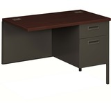 This return with a left pedestal is part of the Metro Classic Series, a forward-thinking flashback that marries 1960s styling with today's technology and offers excellent performance with best-in-class construction, easy-care laminate tops, built-in wire management and more. With tubular steel legs painted to match the return body, Metro Classic gives you a clean look from top to bottom. Pedestal features Tru-Fit mitered drawer fronts for precision alignment when closed. Contract-grade, multi-ply laminate stands up to scratches, spills, stains and boiling liquids. Recessed plastic drawer handles are color-matched to HON core paint colors. The reinforced, double "O" frame for an inner structure keeps return solid and sturdy for years of use. All drawers lock by securing the center drawer; lock core can be changed as security needs require. High-sided file drawer accepts hanging files without hangrails. Box drawer is equipped with 3/4-extension, steel ball-bearing suspensions.