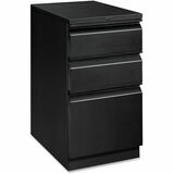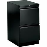 Mobile pedestal with HON Brigade Series 800 lateral-pull design fits under standard HON Initiate, 38000 Series and 29-1/2" worksurfaces. Freestanding pedestal offers a 19-7/8" depth and two file drawers with ball-bearing suspension (90 percent extension). High-sided file drawers feature two crossrails and accommodate front-to-back filing for letter-size, hanging file folders. Counterweight inhibits tipping when opening more than one drawer. Black pedestal is also equipped with a HON One Key interchangeable, core-removable lock; fixed front casters; and swivel rear casters. Pedestal meets or exceeds ANSI/BIFMA and ISTA performance standards.