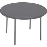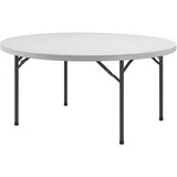 Round folding table is made for heavy-duty use indoors or outdoors yet is 30 percent lighter than standard folding tables. Sturdy construction holds 600 lb. evenly distributed. 2" tabletop is made of durable, blow-molded, high-density polyethylene that is dent-resistant and scratch-resistant. Tubular legs are made of heavy-gauge steel with a powder-coat finish. Legs fold into recessed cavities beneath the table. Folding table is designed to nest with other Iceberg IndestrucTable Too tables when stacking to allow maximum storage capacity.